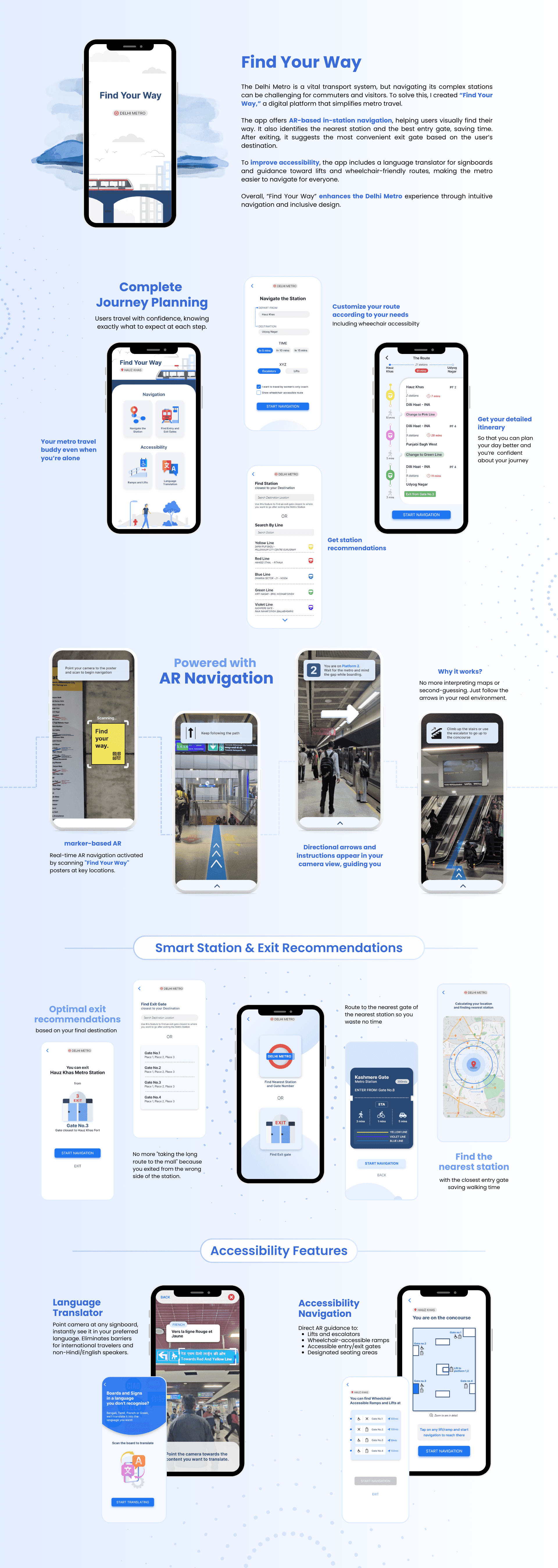 Every day, millions navigate Delhi Metro's 285+ stations—but complex multi-level layouts, color-coded signs, and multiple line changes leave many confused and stressed. I created "Find Your Way," an AR-powered navigation app that guides travelers seamlessly through stations, eliminating the guesswork.