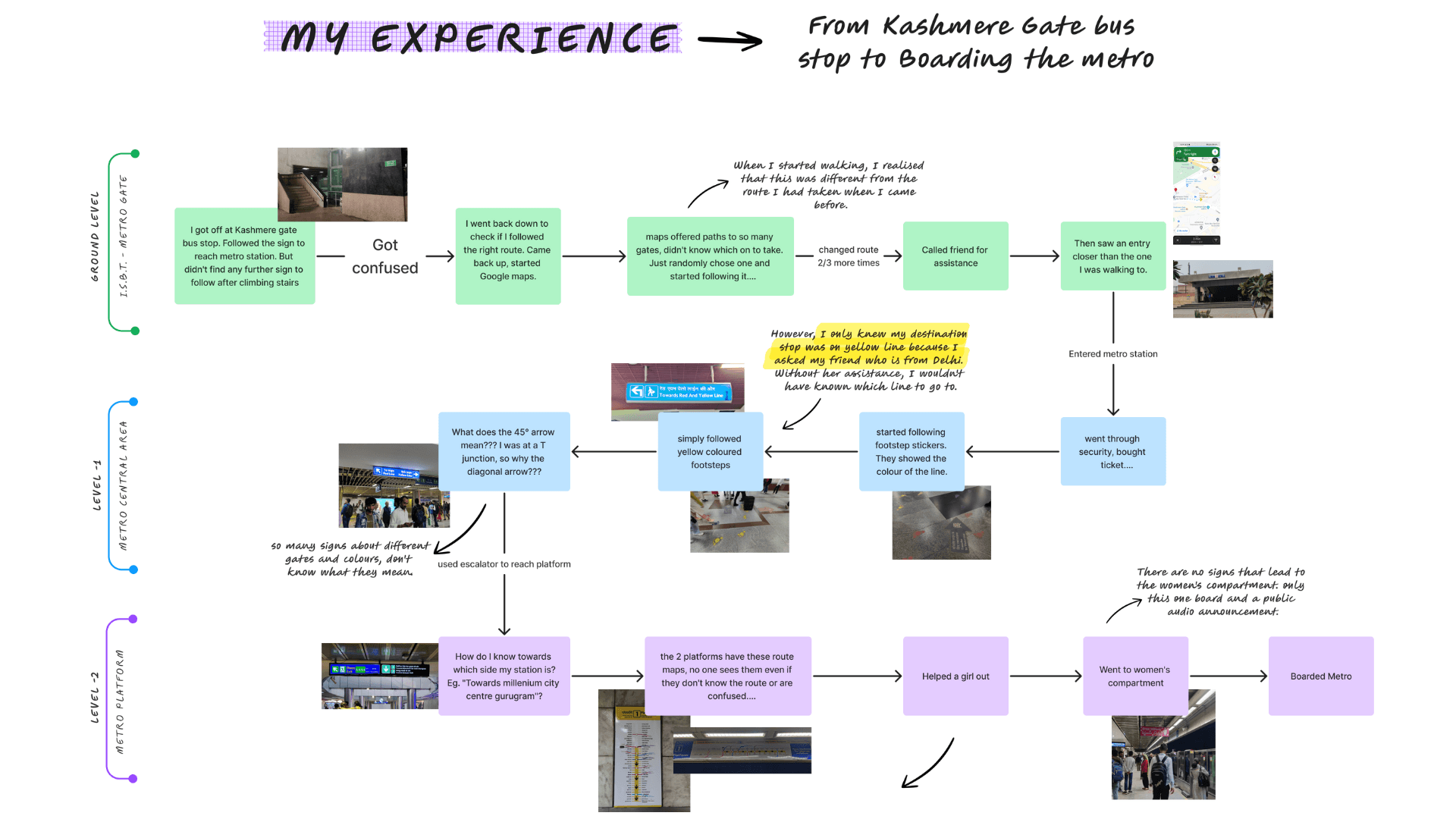 Observing people at metro stations taught me more than any survey could. Seeing facial expressions, hesitation, and how people actually make decisions revealed the emotional dimension of navigation anxiety.